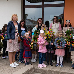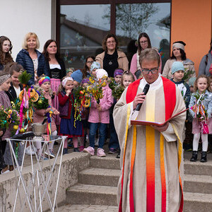 Pfarrer Mag. Gert Smetanig segnete die Palmbäume/Palmbuschen vor der Volksschule.
