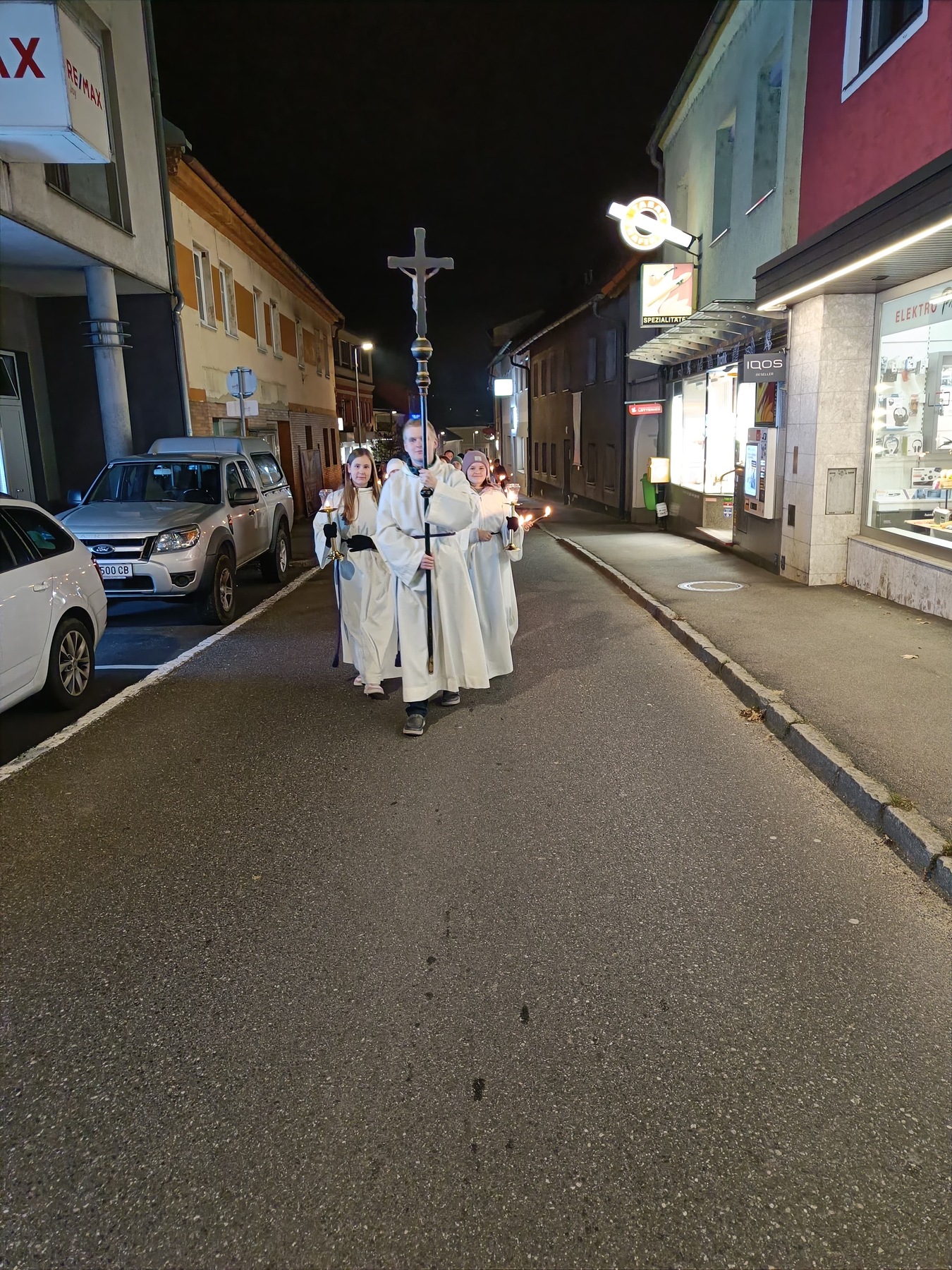 Im Anschluss an die Messe ging ein großer Fackelzug zum Friedhof, wo in der abschließenden Andacht die abendliche Feier beendet wurde. Die Ministrant:innen entzündeten in alter Tradition auch an all jenen Gräbern Kerzen, an denen noch kein Licht brannte. Die Botschaft: Auch für Sie leuchtet das Licht Christi in der Dunkelheit!