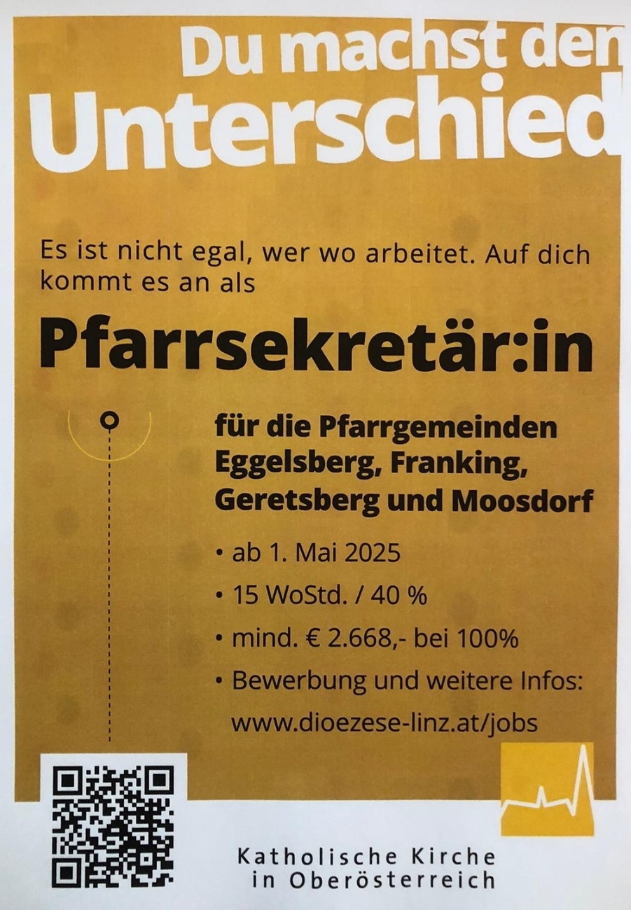 Pfarrsekretär:in gesucht! für die Pfarrgemeinden Eggelsberg, Moosdorf, Franking u. Geretsberg mehr: Pfarrsekretär:in gesucht!