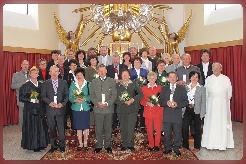 Pfarre, KFB und Goldhaubengruppe laden zu einem festlichen Gottesdienst, der vom Kirchenchor umrahmt und von der Musikapelle aufgespielt wird. Es werden alle Paare eingeladen, die vor 25, 40, 50, 60 oder 65 Jahren aus der Pfarre oder in der Pfarre geheiratet haben.